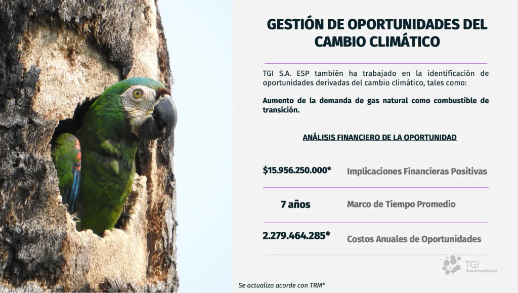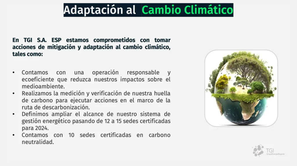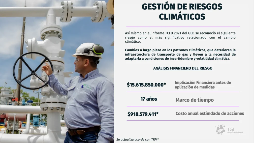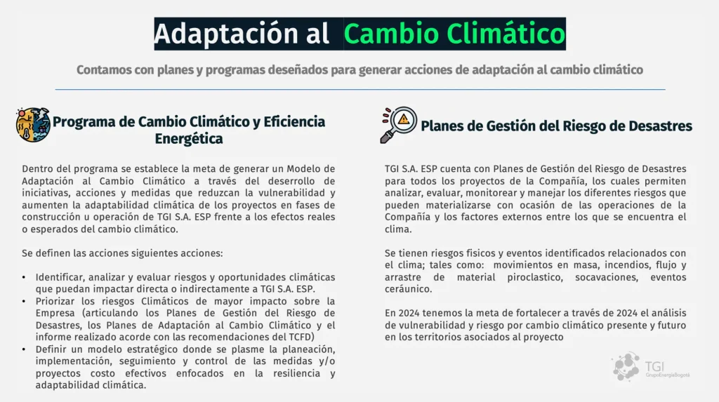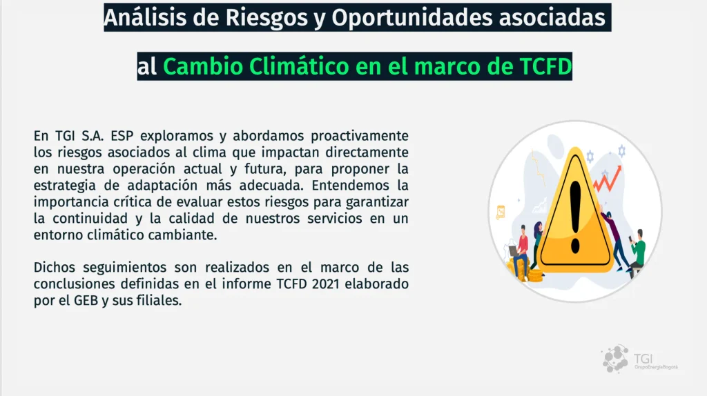 En TGI S.A. ESP reconocemos que el cambio climático constituye un desafío estratégico que demanda una gestión proactiva, integrada y transparente. En coherencia con esta visión, presentamos el Reporte de Gestión de Cambio Climático 2024, elaborado con base en las recomendaciones del Task Force on Climate-related Financial Disclosures (TCFD) para el periodo 2023-2024. Este informe reafirma nuestro compromiso con una transición energética justa y sostenible, y expone cómo integramos los riesgos y oportunidades climáticas en nuestra gobernanza, estrategia, gestión del riesgo y métricas, pilares esenciales para fortalecer la resiliencia y la toma de decisiones a largo plazo.